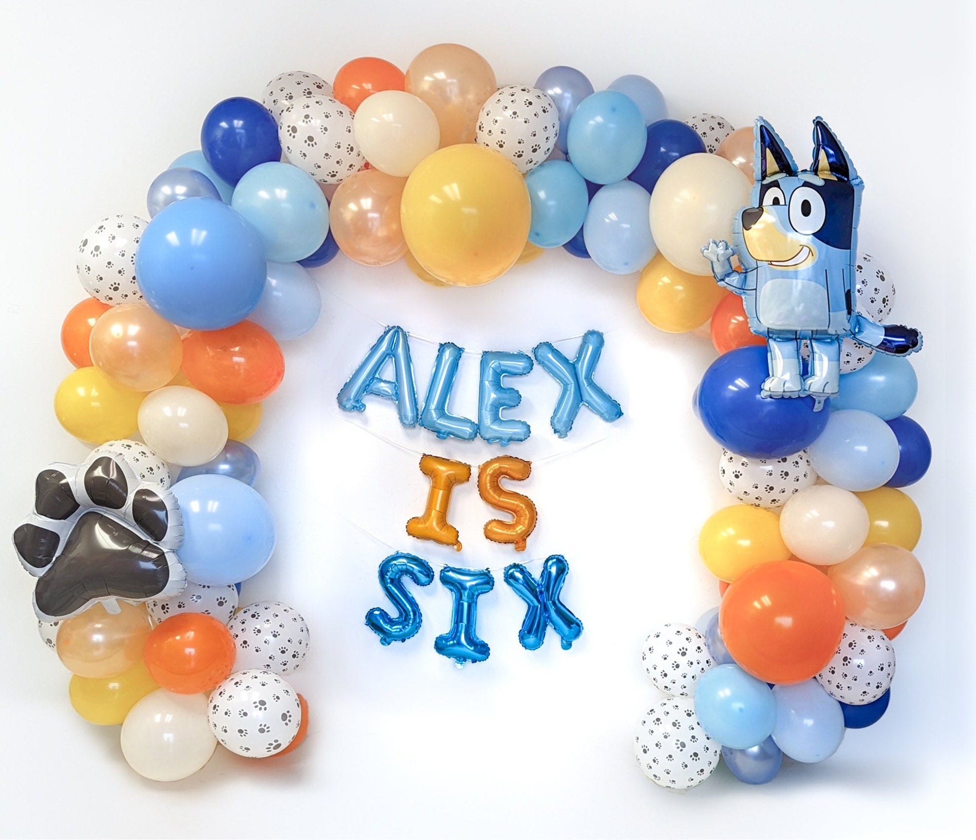 - The "*NAME* IS *AGE*," paw print, stars, and Bluey balloons are add-on items; you can purchase these from the button menu. If you would like to spell something else with the letter balloons please leave a note on your order during checkout.