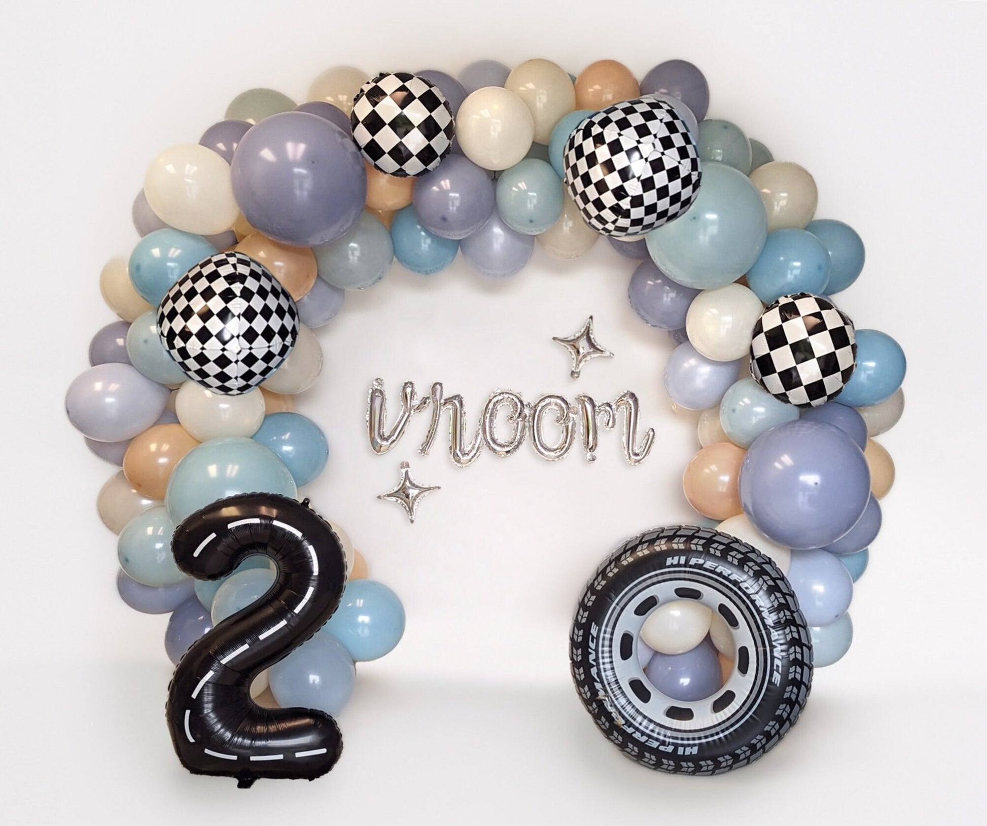 - The tire, jumbo number, checkered circles, stars and "VROOM" balloons are add-on items; you can purchase these from the button menu. If you would like to spell something else with the letter balloons please leave a note on your order during checkout.