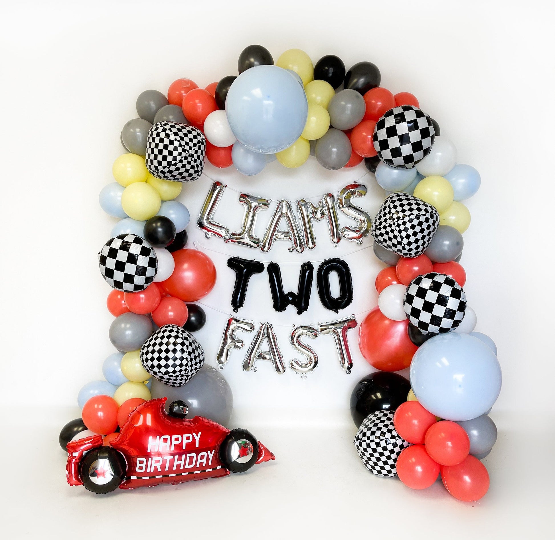 - The jumbo number, racecar, checkered circles and "*NAMES*TWO FAST" balloons are add-on items; you can purchase these from the button menu. If you would like to spell something else with the letter balloons please leave a note on your order during checkout.